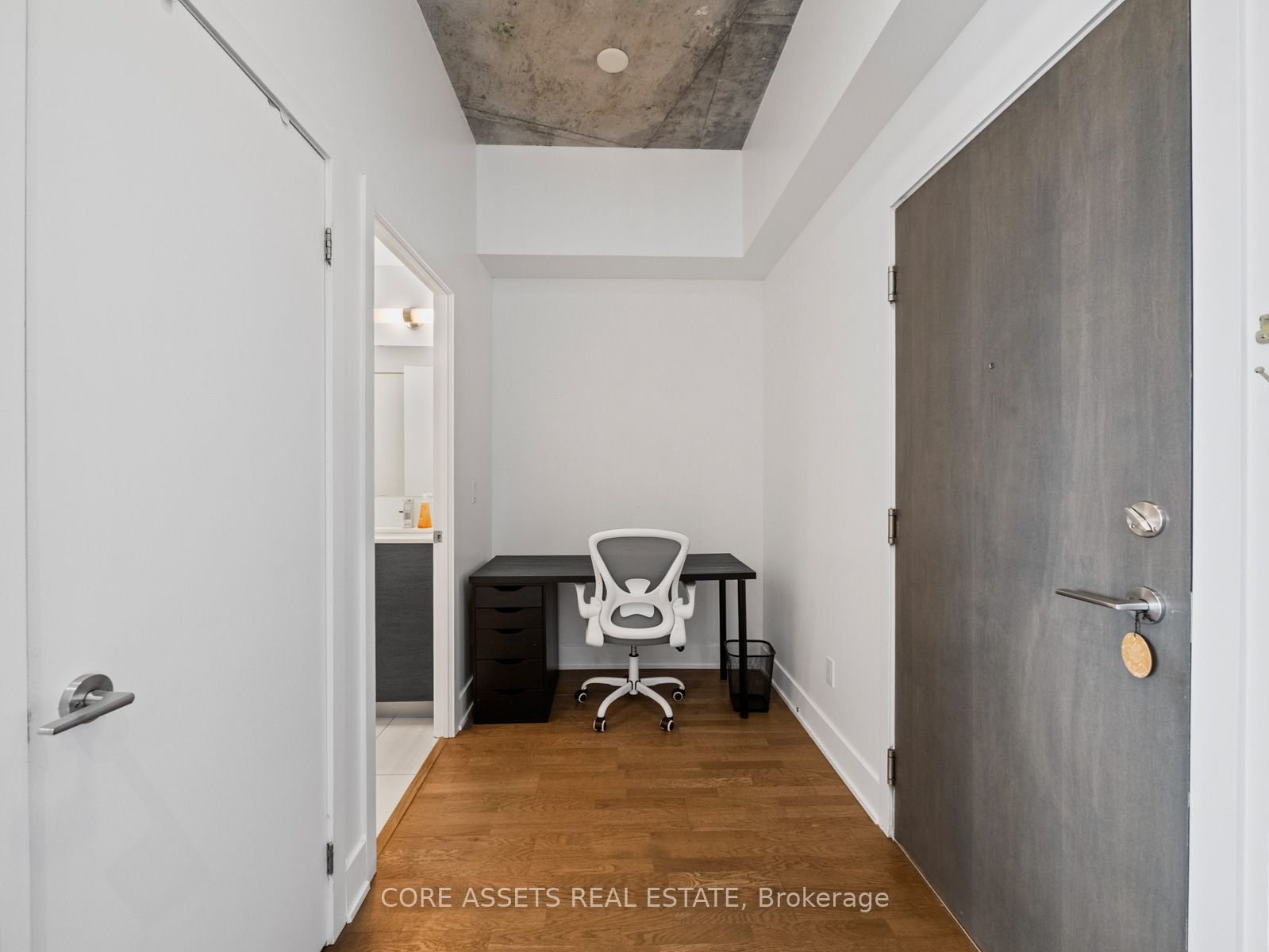 Welcome to an urban oasis where contemporary elegance and rich history converge! Nestled in an exclusive boutique building, this stylish loft offers breathtaking city skyline views and access to an incredible rooftop terrace perfect for those WFH days, entertaining, and soaking in the city's vibrant energy. Plus, the building is incredibly pet-friendly - even dogs are welcome to enjoy the rooftop terrace! Step inside and experience elevated downtown living. This beautifully designed suite boasts soaring 10-ft concrete ceilings, creating an airy, industrial-chic ambiance. An open den makes for the perfect home office, while the sleek kitchen is outfitted with extended-height cabinets, a modern subway tile glass backsplash, and premium finishes that make cooking a delight. Wall-to-wall windows flood the open living area and bedroom with natural light, showcasing picturesque southeast views. The spa-inspired bathroom features elegant quartz countertops and stylish subway tile, while the stacked washer/dryer ensures effortless convenience. Retreat to the serene bedroom, where wall-to-wall closets provide ample storage, real operable windows bring in fresh air, and frosted glass doors add a touch of privacy. Enjoy unparalleled access to the rooftop terrace, located up one flight of stairs directly adjacent to the unit. It's the perfect spot to unwind, enjoy dinner with a view, or even work from home in a unique open-air setting. Situated at the historic intersection of Trinity Street and Eastern Avenue, this eight-story gem places you within walking distance of Corktown, the Distillery District, West Don Lands, and Downtown East. Plus, it's just around the corner from the future Ontario subway stop, ensuring seamless access to the best of Toronto's culture, dining, and entertainment right at your doorstep. The unit comes with 1 parking space and 1 locker.